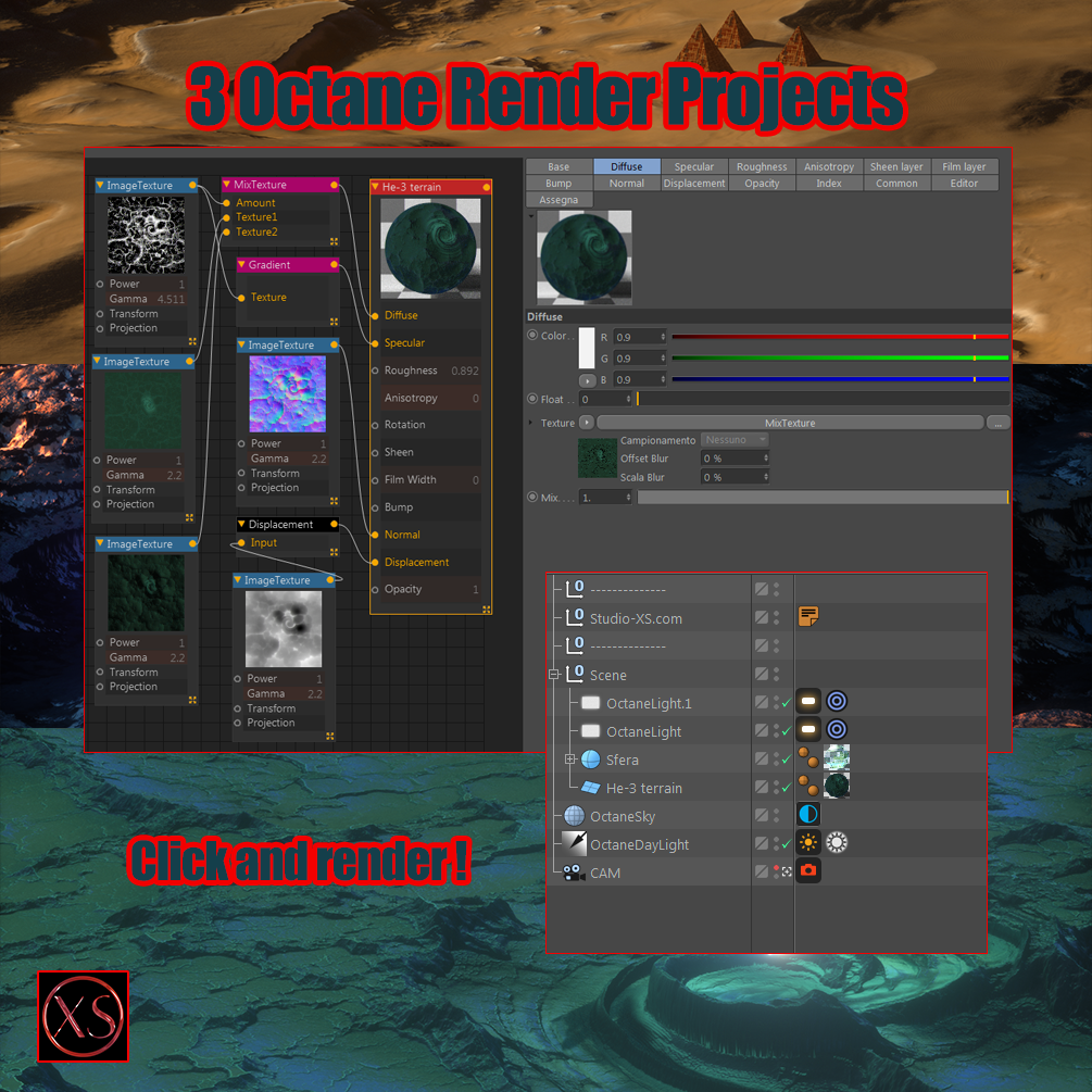 3 Cinema 4D project files with Octane Render setup of all materials for HiQuality renders!